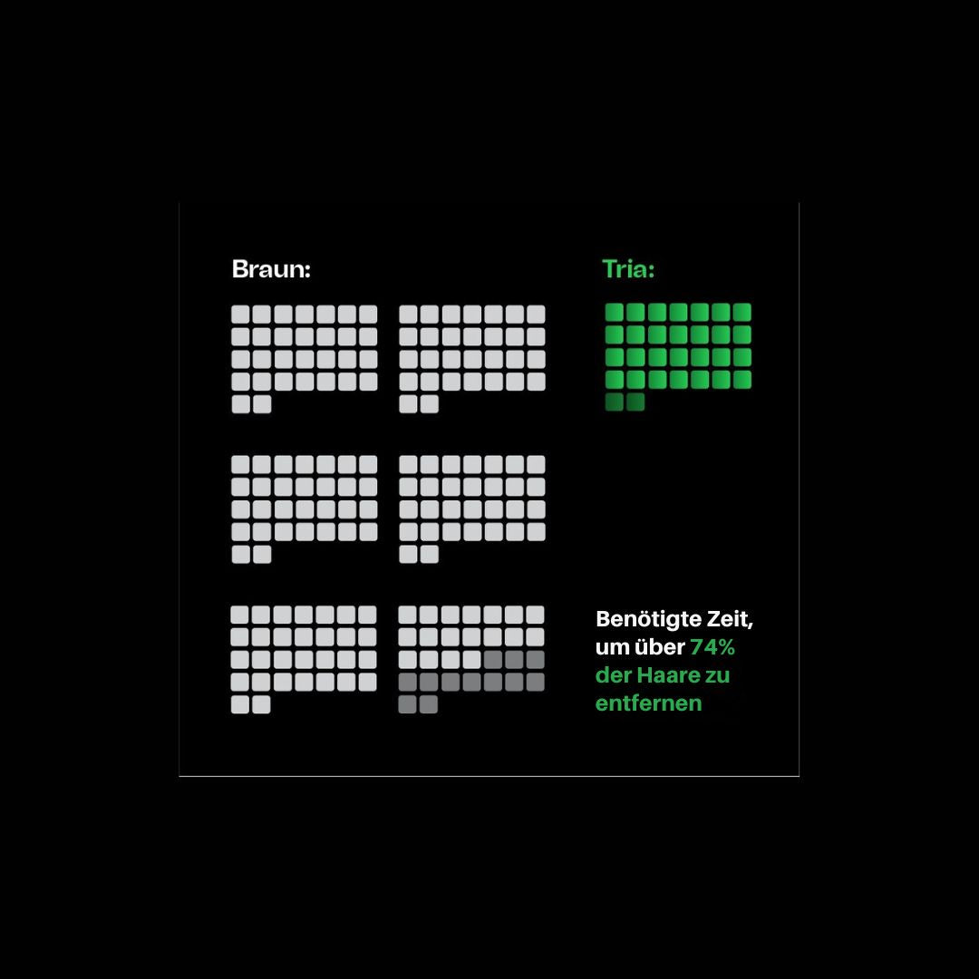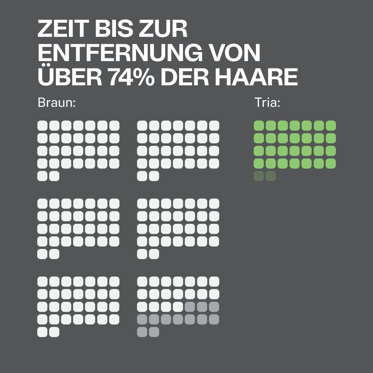Braun erreicht bis zu 74% Haarreduzierung nach 12 Anwendungen. Der Tria ermöglicht hingegen bis zu 100% Haarentfernung bereits nach 8 Anwendungen.