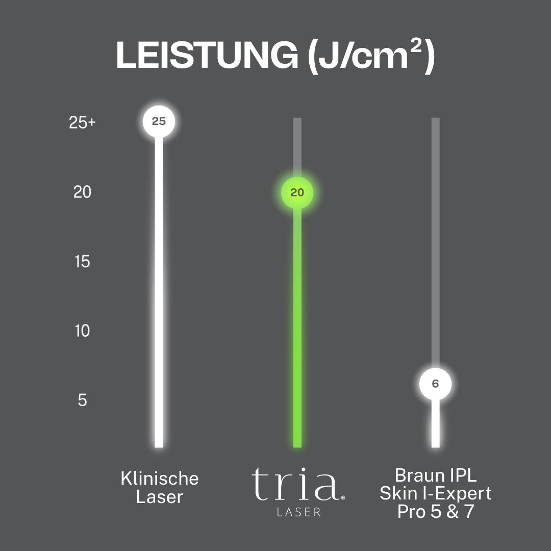 Der Tria 4X Laser zur Haarentfernung liefert 20 J/cm² pro Impuls – über 3 Mal mehr Leistung als die 6 J/cm² des Braun IPL Silk-Experts Pro.