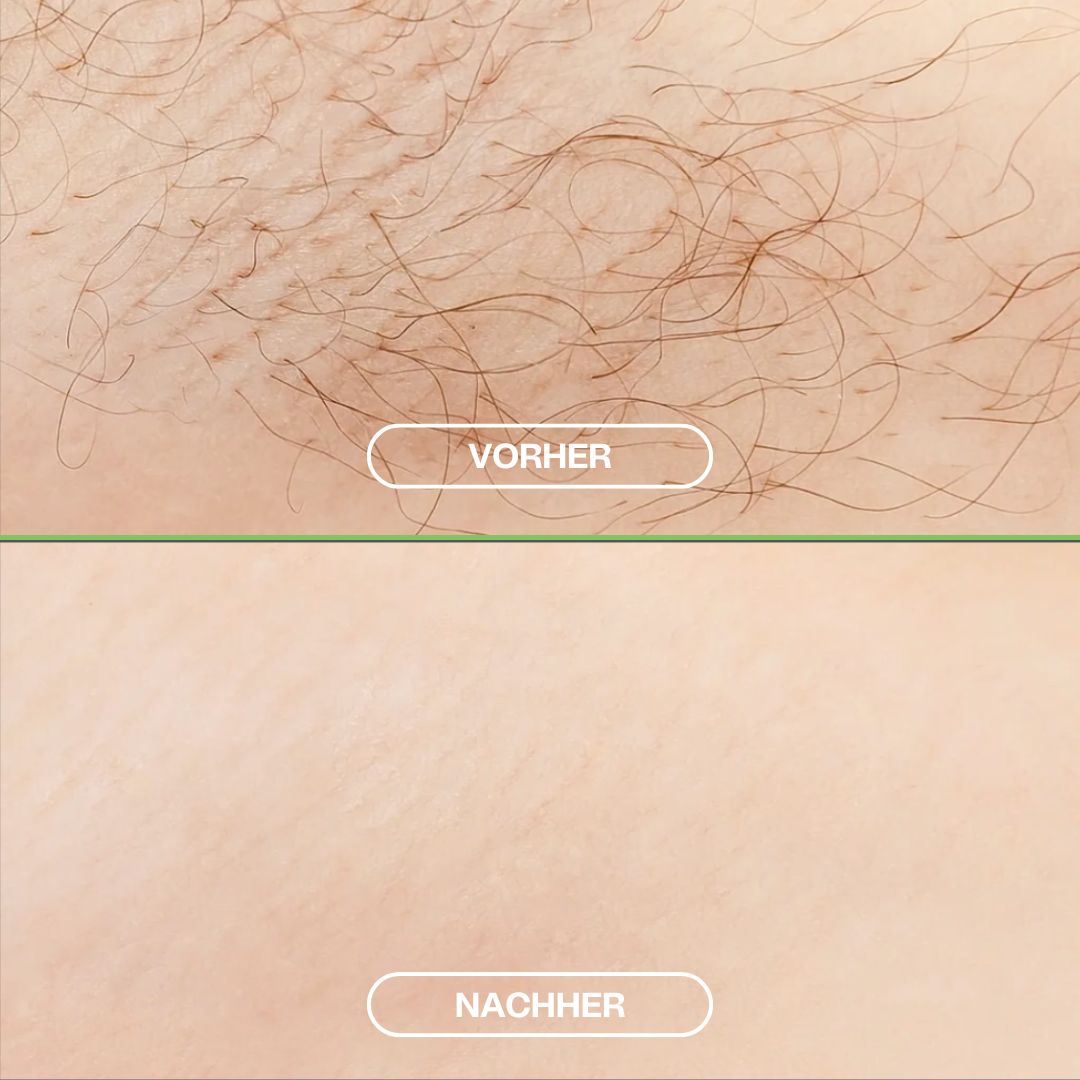Eine sichtbare Haarreduzierung ist bereits nach nur 2 Behandlungen erkennbar, mit zunehmend deutlicheren Ergebnissen nach jeder weiteren Behandlung und bis zu 100% Haarentfernung nach nur 8 Behandlungen. Die Ergebnisse können je nach Haarstärke, -farbe und -dichte variieren.