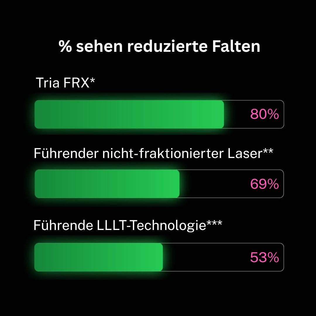 80% der Tria FRX-Nutzer:innen sehen weniger Gesichtsfalten* – im Vergleich zu nur 69% beim führenden nicht-fraktionierten Laser** und nur 53,8% beim führenden LLLT-Gerät.***
