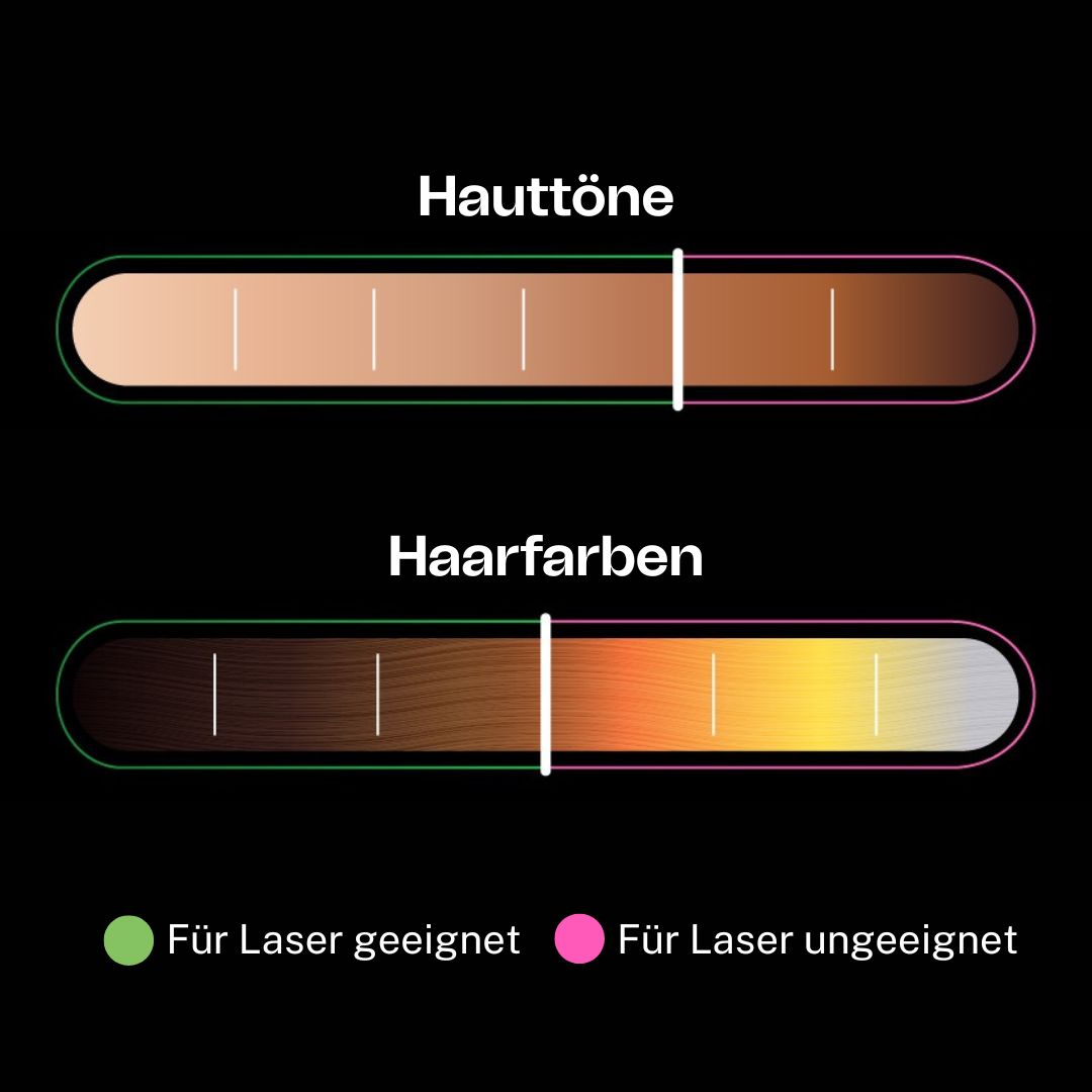 Unsere präzise Diodenlaser-Technologie zielt auf das Melanin (Pigment) in Ihren Haaren ab, das auch in dunkleren Hauttönen vorhanden ist. Leider bedeutet dies, dass die Anwendung nicht für alle Haut- und Haartypen geeignet oder wirksam ist. Die Farbtabellen dienen ausschließlich zu Illustrationszwecken. Bitte konsultieren Sie das Benutzerhandbuch, um weitere Informationen zu sicheren und wirksamen Hauttönen und Haarfarben zu erhalten.